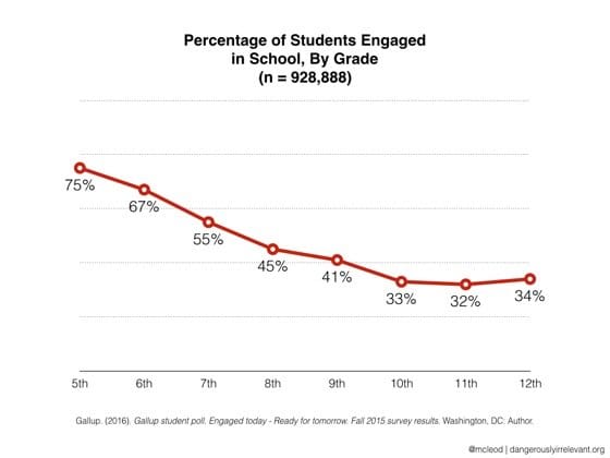 Just look at this chart from Scott McLeod showing the results from a million students surveyed on their schooling experience. Every year in the school system leads to less and less engagement.